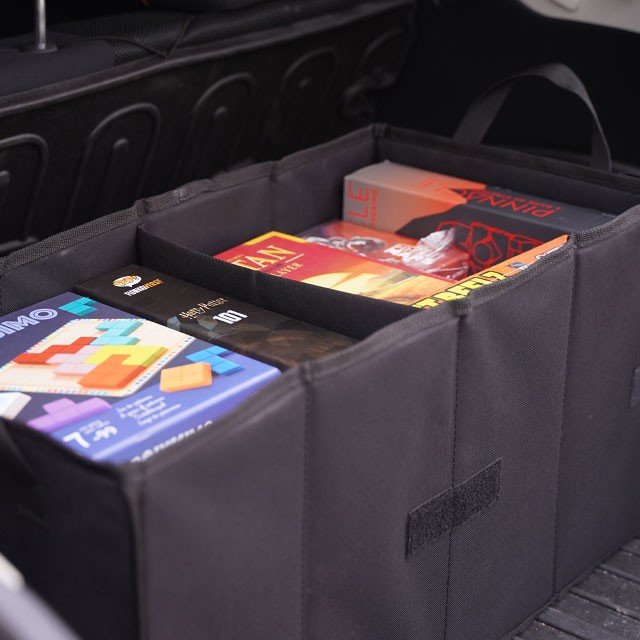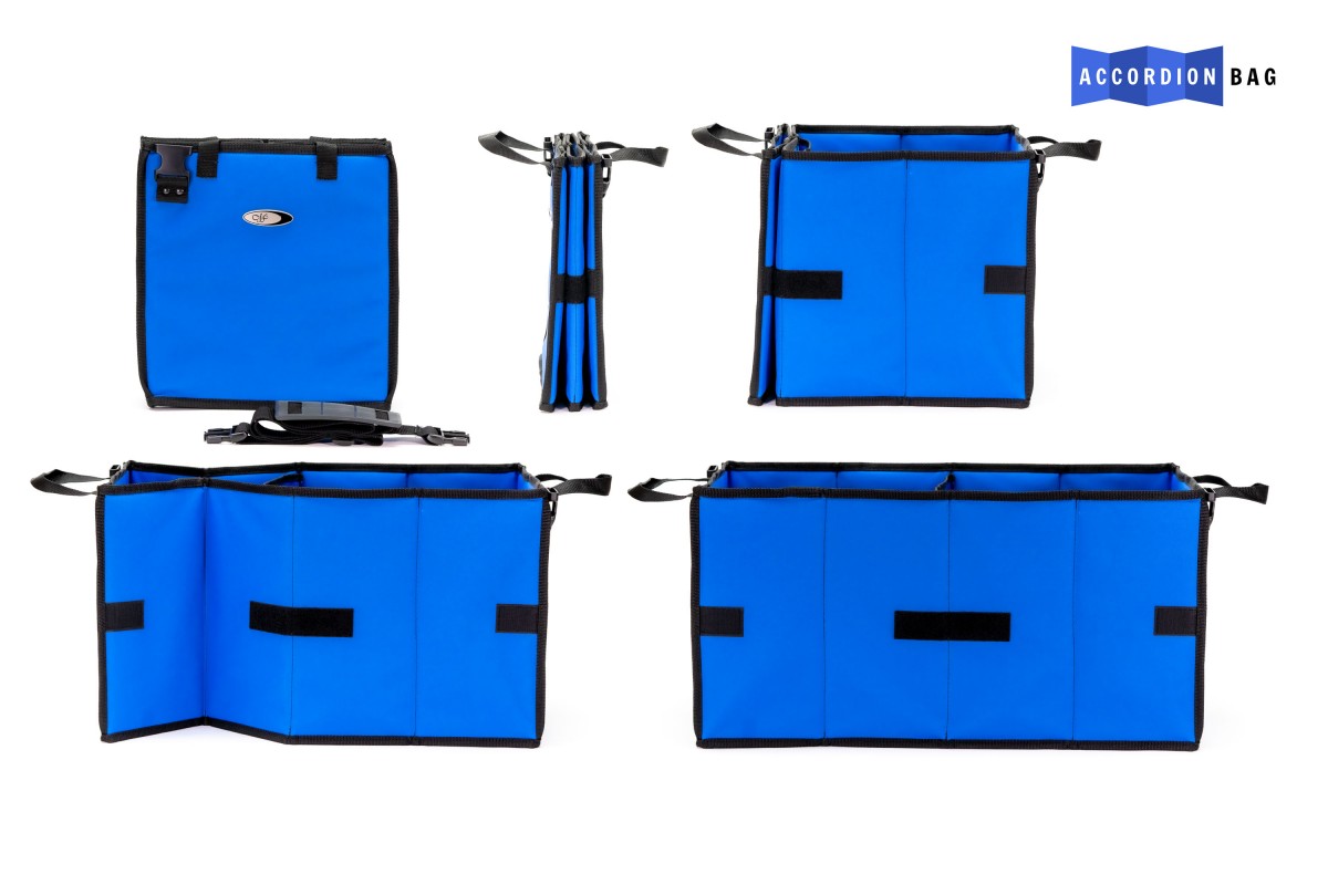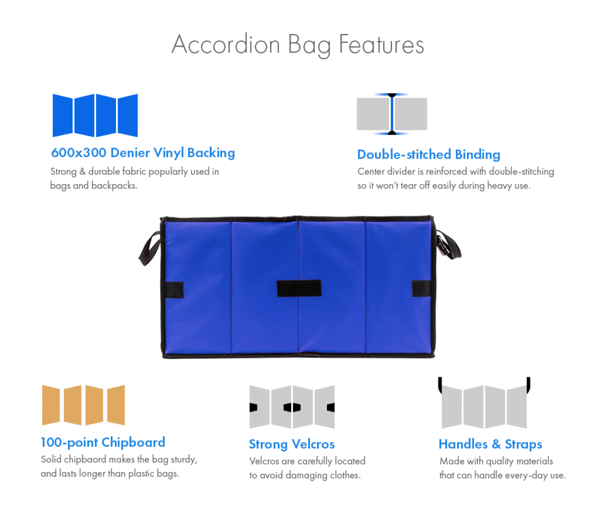 Accordion Bag is Versatile! It can be used as a storage for items like board games when you need to carry them to different places. It is sturdy enough to stand on its own, so it is also very useful as a storage bin or organizer for your car trunk. When you are done using, you can fold it up to save space.